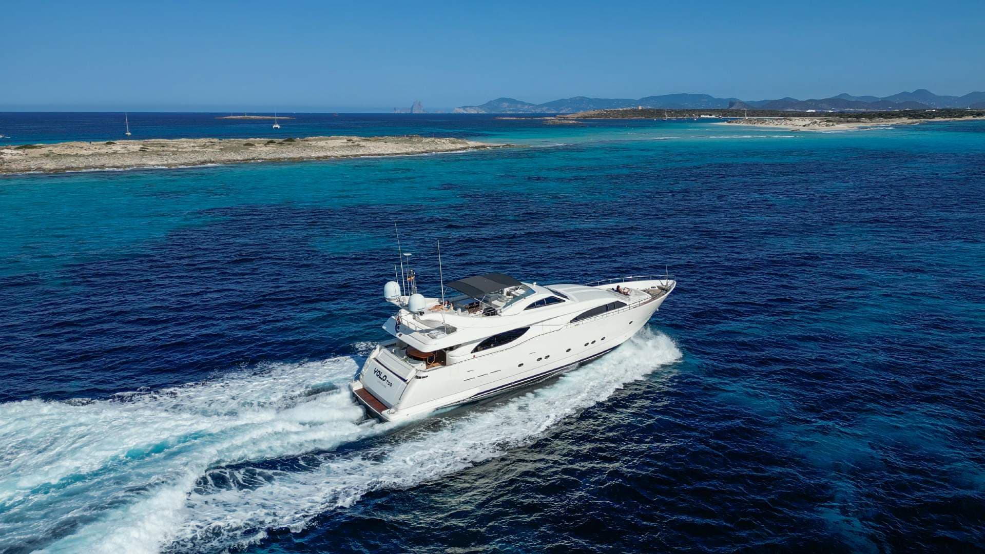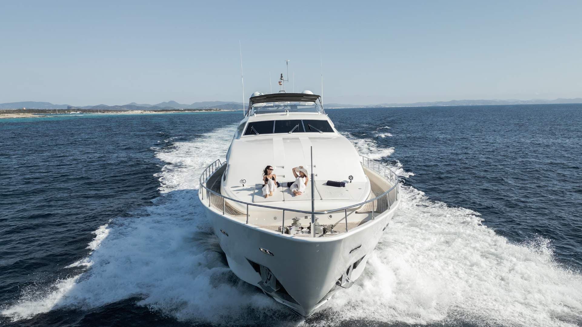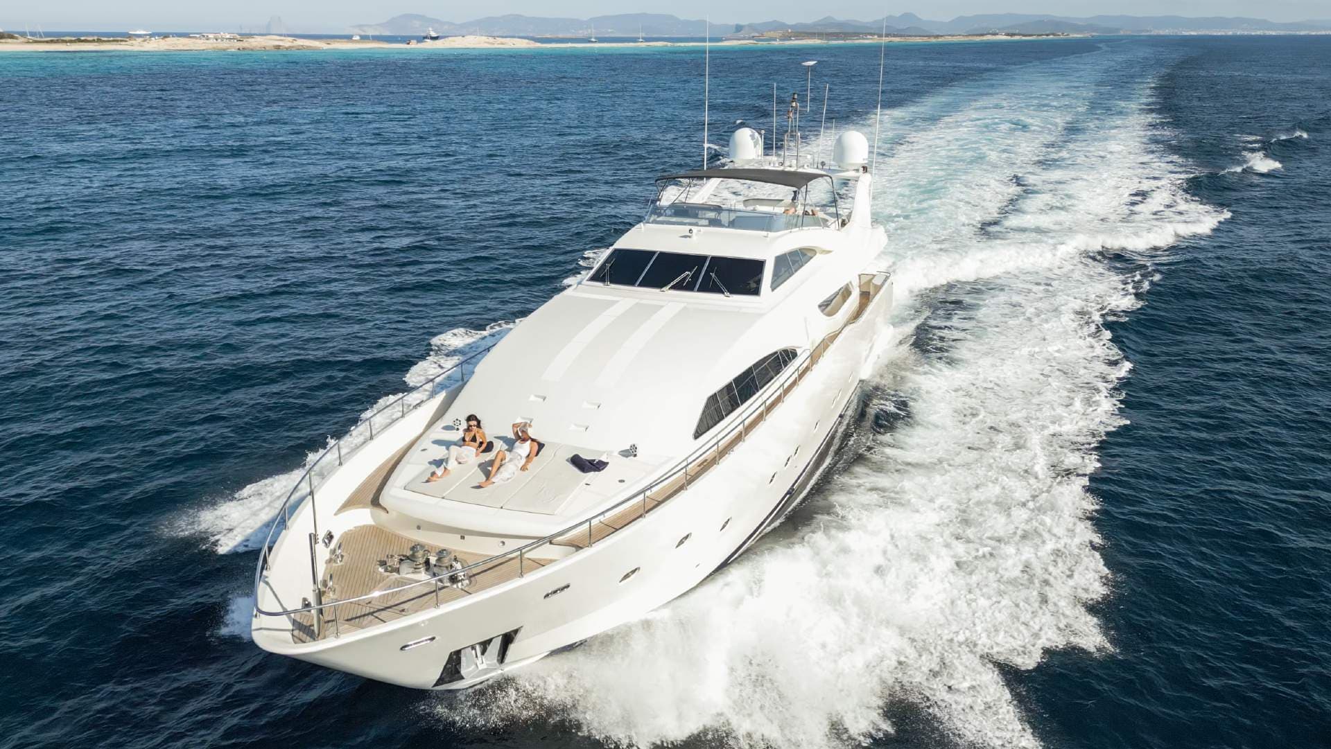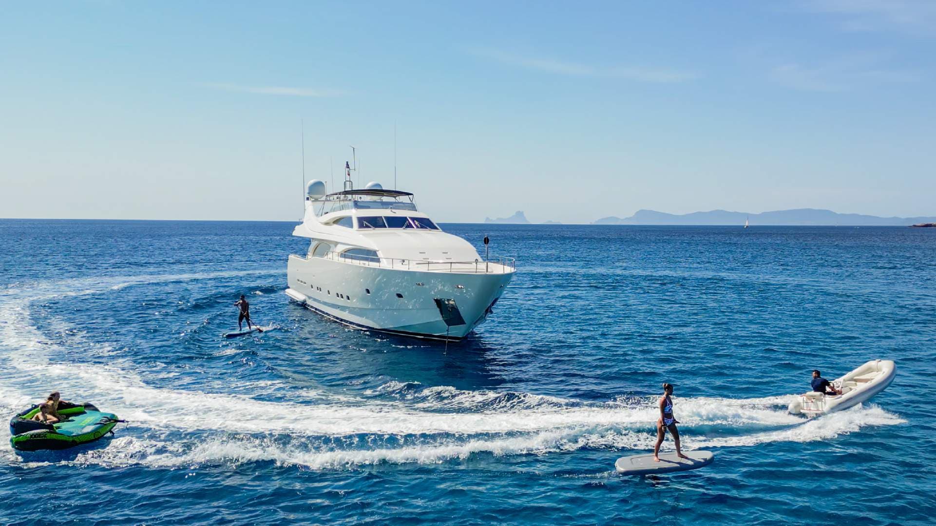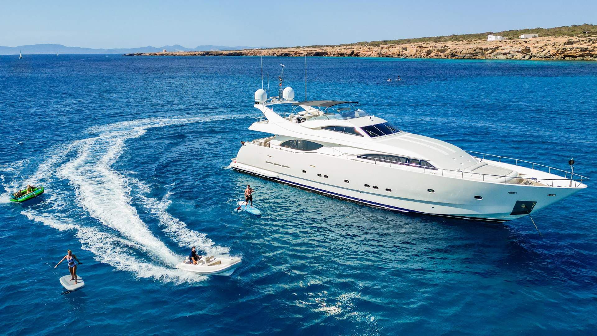 El Ferretti 94 YOLO TOO ofrece amplios espacios sociales, camarotes de lujo y servicio gastronómico a bordo. Con jet-ski, paddleboards y juguetes acuáticos para un día perfecto en Ibiza.