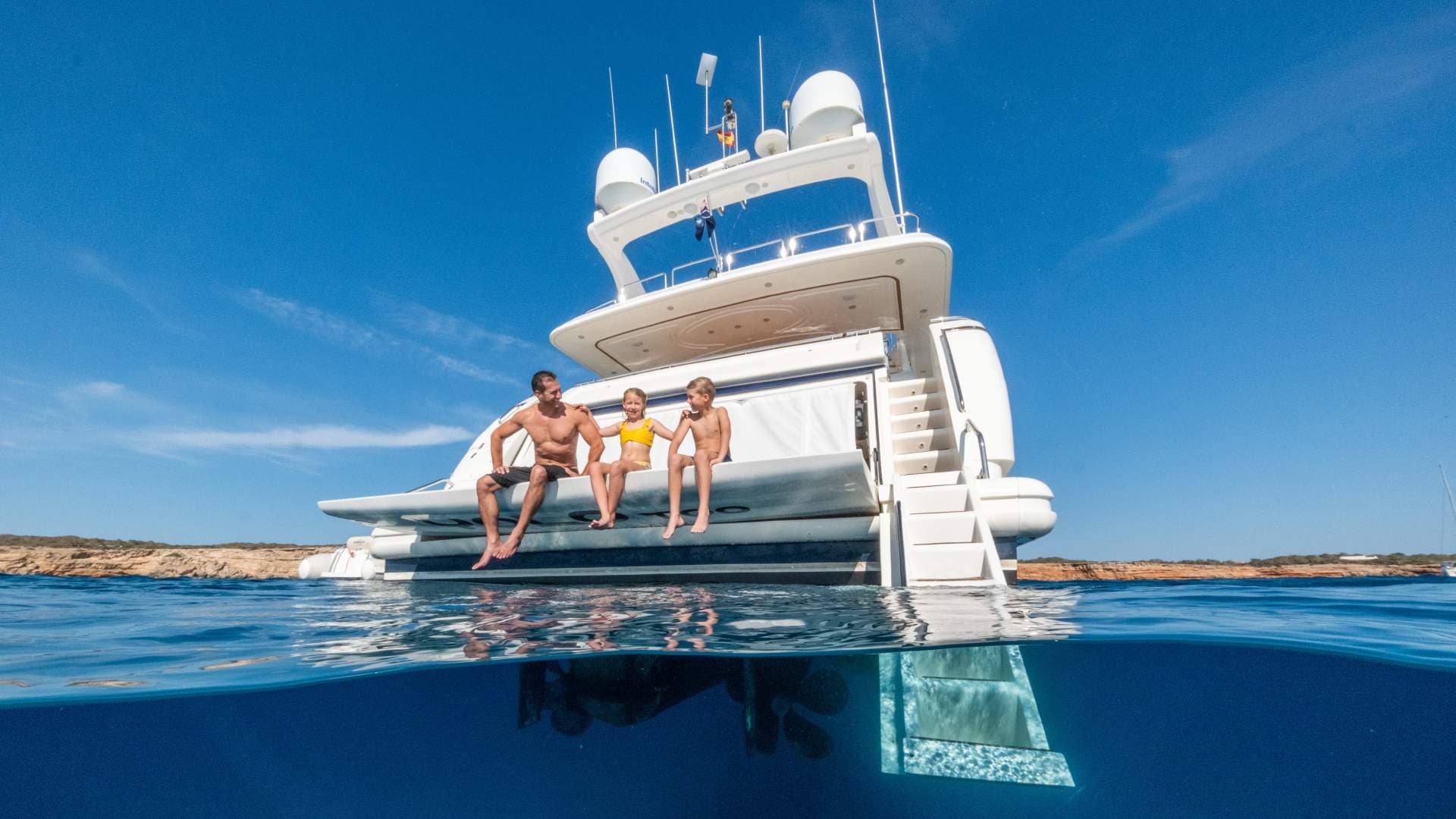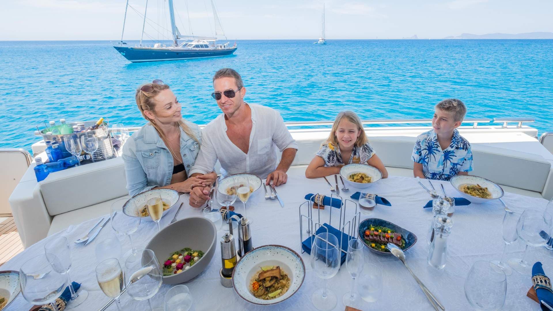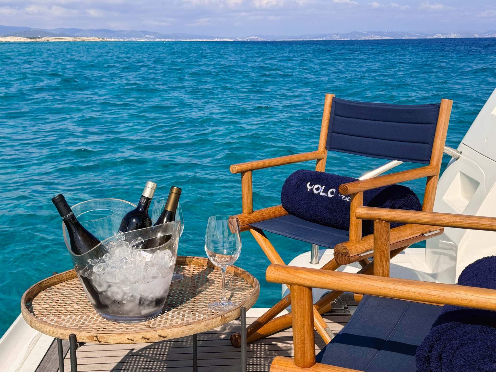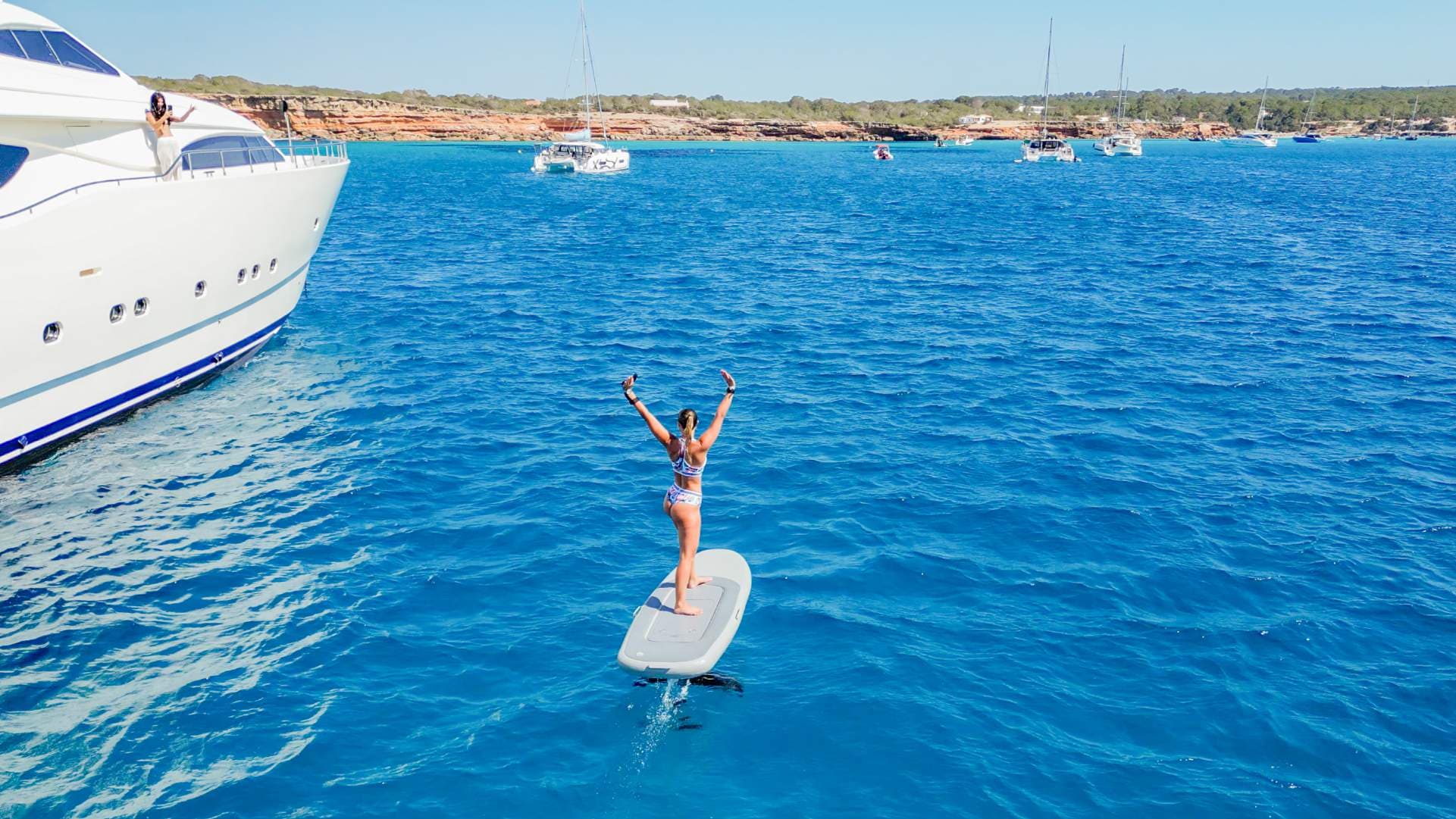 El Ferretti 94 YOLO TOO ofrece amplios espacios sociales, camarotes de lujo y servicio gastronómico a bordo. Con jet-ski, paddleboards y juguetes acuáticos para un día perfecto en Ibiza.