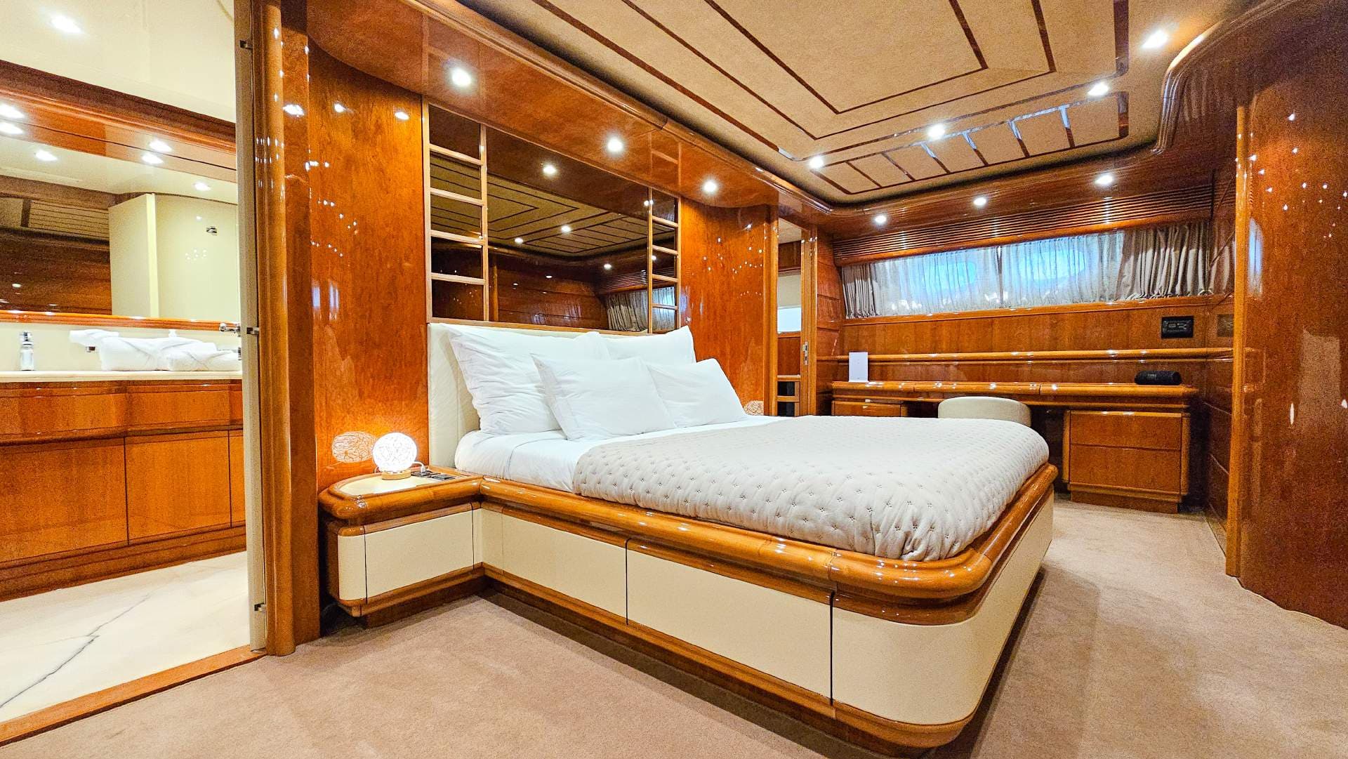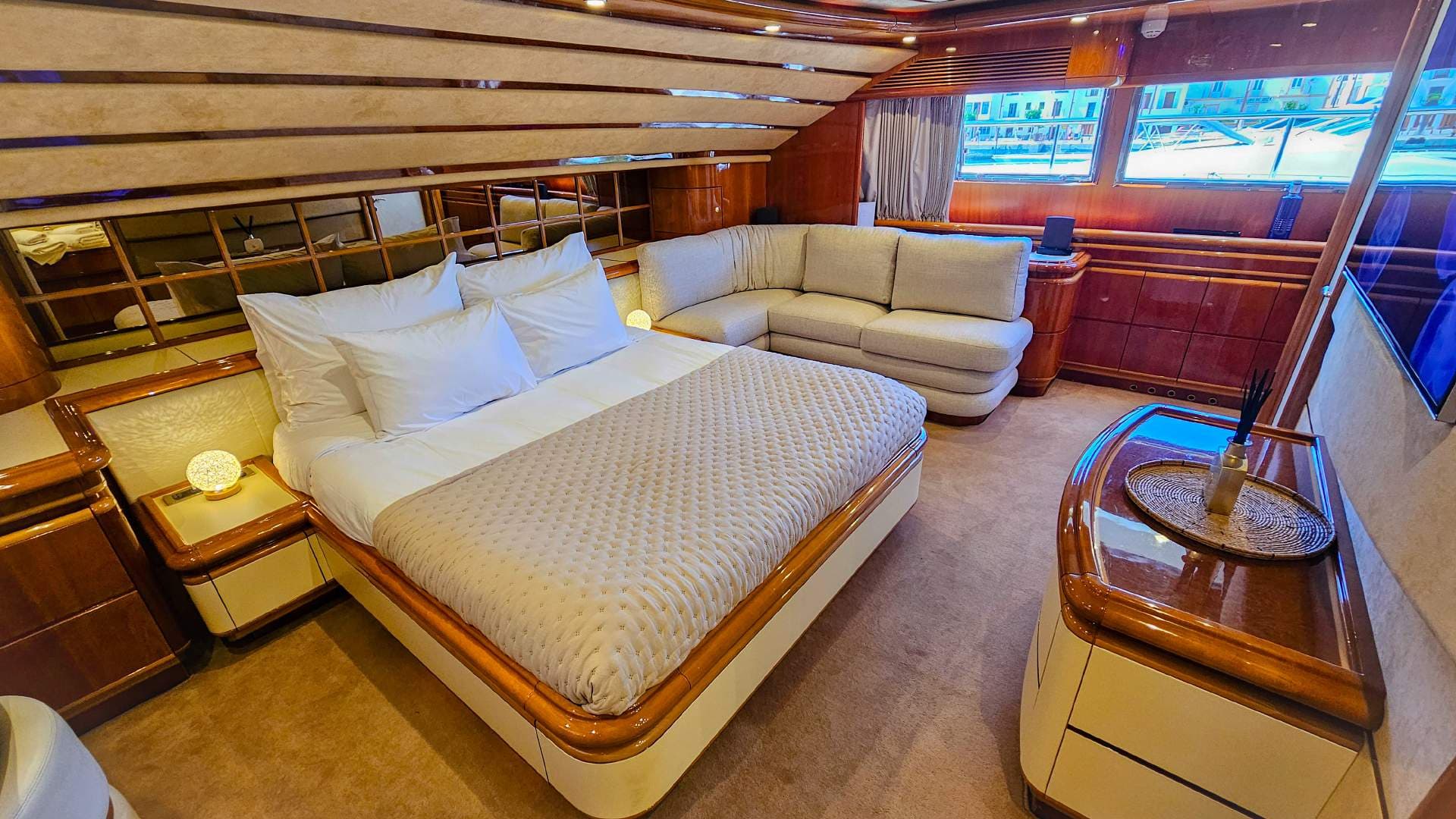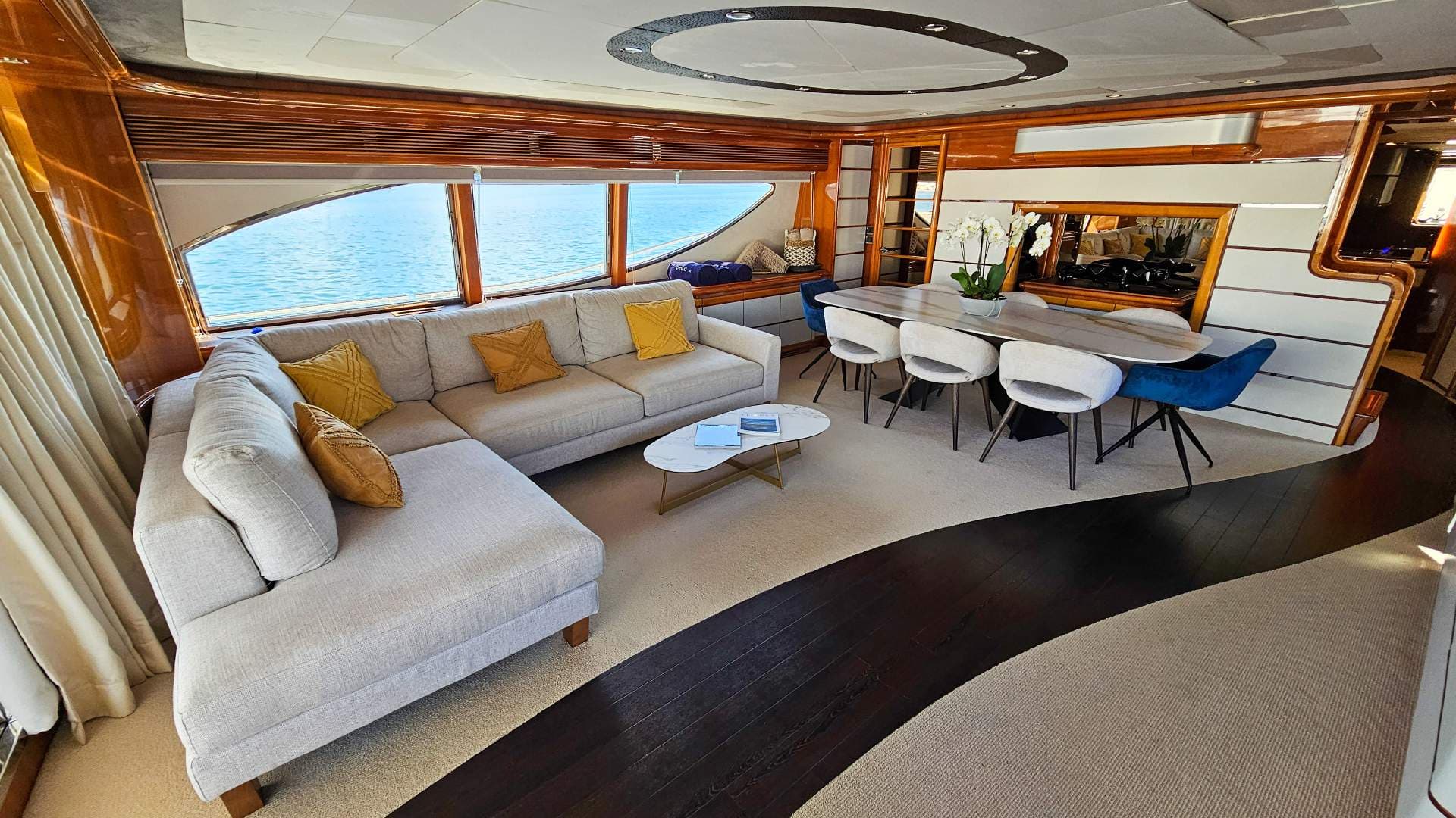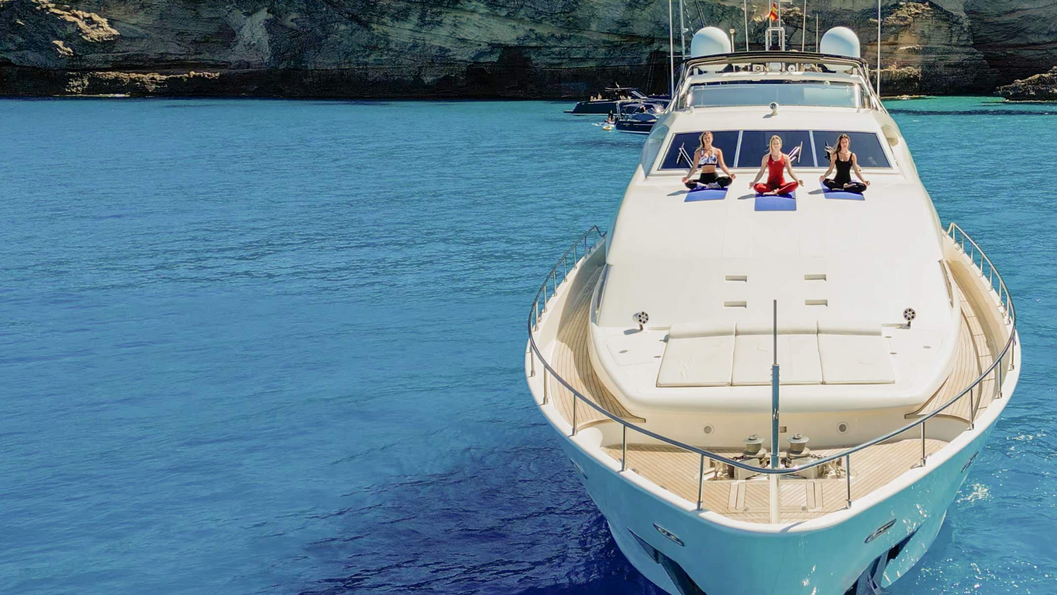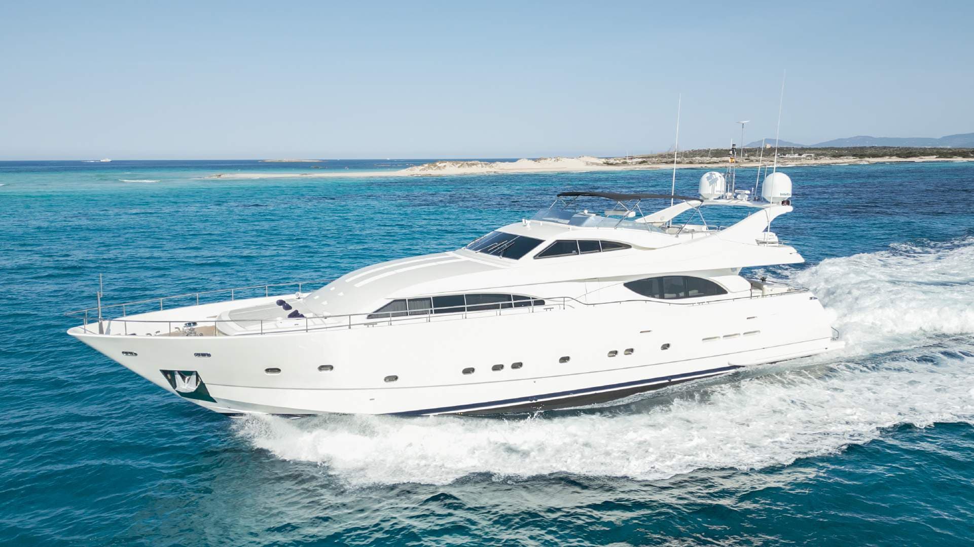 El Ferretti 94 YOLO TOO ofrece amplios espacios sociales, camarotes de lujo y servicio gastronómico a bordo. Con jet-ski, paddleboards y juguetes acuáticos para un día perfecto en Ibiza.
